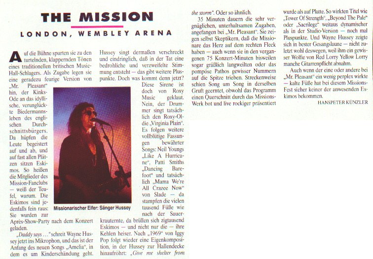 Inzwischen ist es neun Uhr, und in der Philipshalle veranstalten einige tausend Fans einen beeindruckenden Spurt gen Bühne. Moderator Alan Bangs kündigt The Mission an, die ursprünglich zum Schluß auftreten sollten. Daß sie nicht als Krönung kommen, macht nichts, denn die Briten spielen ihr schleppendes Blues- und Pathos- Konglomerat inzwischen auch etwas straffer; jedwede Verantwortung für Eigenständigkeit und Aussagekraft bleibt immer noch alleine an Sänger Wayne Hussey hängen, da der Rest der Kapelle eher orientierungslos umhermusiziert.