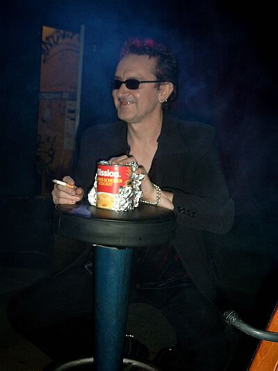 Da standen wir also: In Weinheim, irgendwo hinter Darmstadt, auf einem riesigen Parkplatz - im Regen! Hmm, und wo war jetzt das Cafe Central? Wir suchten eigentlich nach einem Cafe-ähnlichen Laden, standen jedoch vor einem verwitterten Gemäuer, welches mich mehr an meine alte Grundschule erinnerte. Vier Augenpaare starten in die Dunkelheit und eins davon erblickte endlich das Hussey Tourplakat über einer großen Treppe. Und siehe da, ein Stück drüber schimmerte eine silberne Discokugel durch die verregneten Scheiben. Wir waren also richtig und betraten das ehrwürdige Gebäude. Oben angekommen, stand auch schon Mr. Hussey im Rahmen und begrüßte uns amüsiert. Jau, wir schon wieder!
